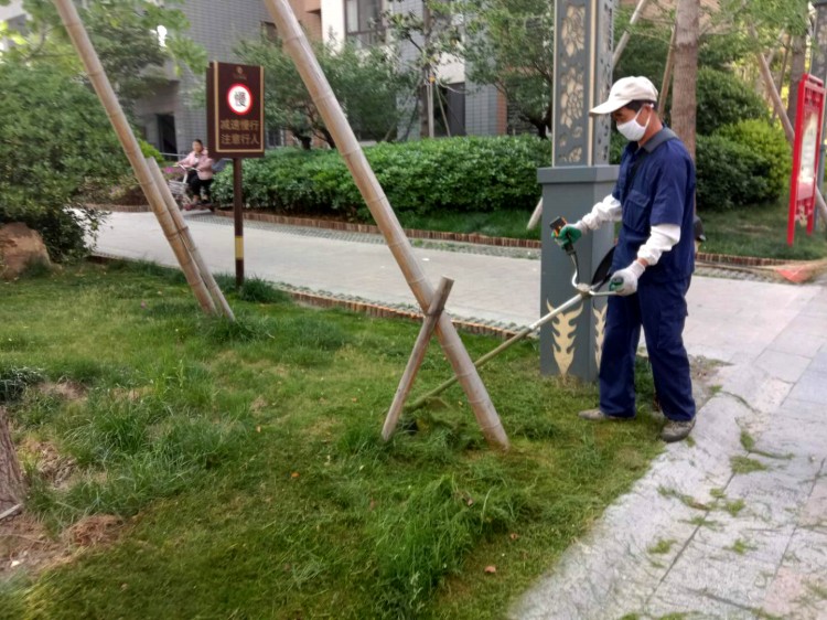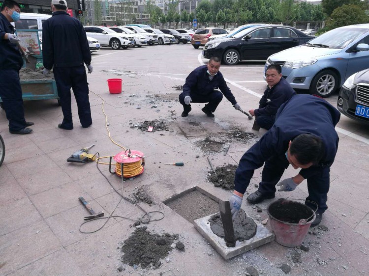 物業對損壞道路地磚進行修補對草坪進行修剪